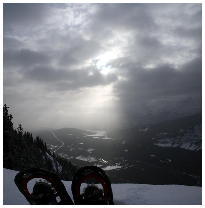 하지만 정상에 올라서서 내려다 보는 눈덮힌 카나나스키스 레이크와 주변 산들은 장관이였습니다. 저기압이라 구름이 안개처럼 산 사이를 흘러가서 가까운 산밖에는 볼 수 없었지만 가끔 구름 사이로 해가 나오면 가시거리가 좀 길어지기도 했습니다.