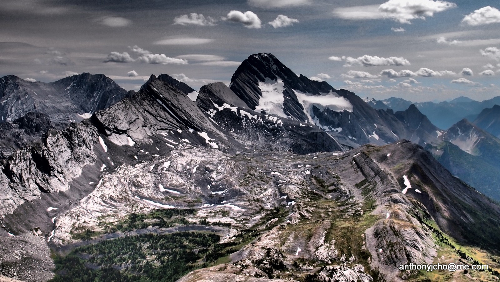 Peter Lougheed Park 안에 Burstall Lake 에서 서쪽으로 5km 정도 거리에 있는 Snow Peak (2865m) 정상에서 찍은 사진입니다. 이날 날씨가 너무 좋아서 아무데나 놓고 찍어도 잘 나왔는데 그 중 가장 마음에 드는 사진입니다.