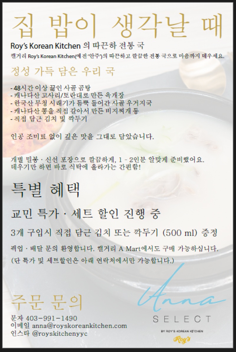 집 밥이 생각날때.. Roy's Korean Kitchen 의 따끈한 전통 국과.. 특별 혜택 진행중