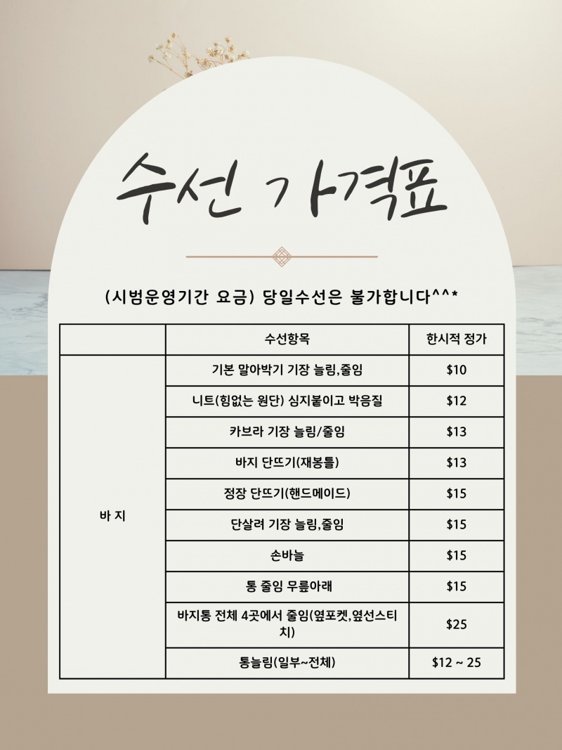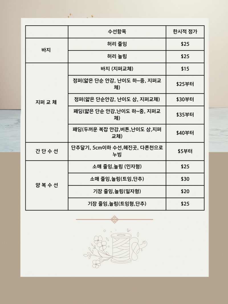 의류 수선과 수선 교실을 함께 운영하고 있으며, 에드먼튼 시청 비지니스 라이센스를 발급받아 정식 운영 중입니다. 현재 시범 운영 기간으로, 추후 가격이 조정될 수있습니다.