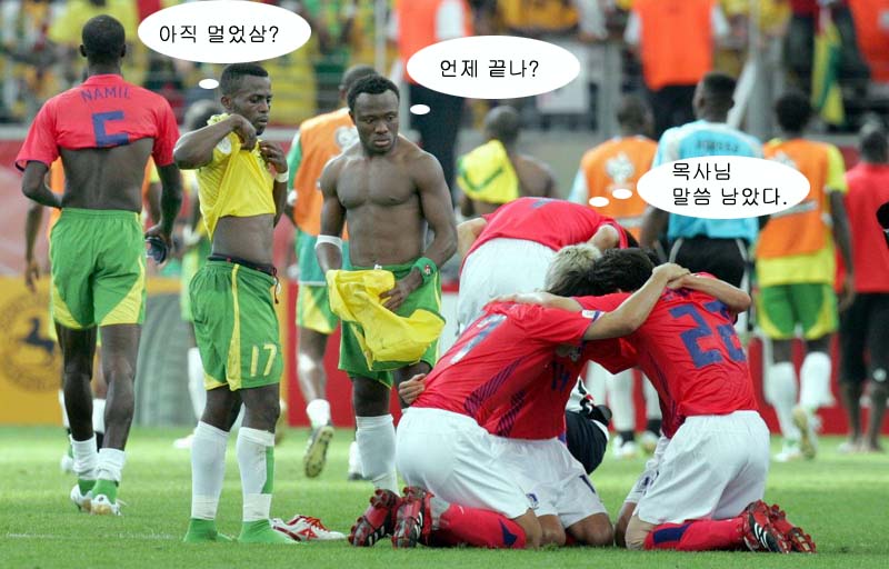 두명의 토고선수가 요즘 상한가를 친다는 한국팀 유니폼과 바꾸기 위해 초조하게 기다리는 반면에,