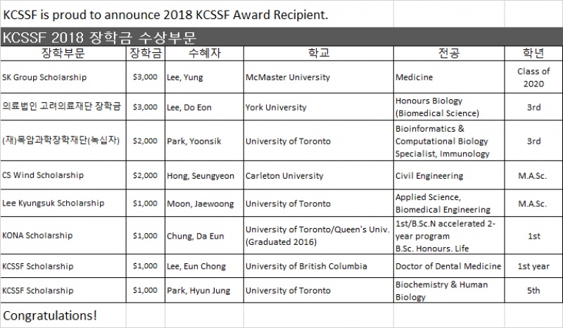 캐나다한인과학기술자협회 장학재단 장학금 수혜자 명단 발표
