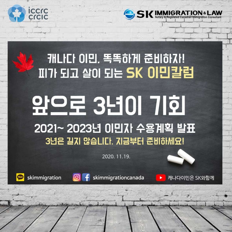 최근 코로나 바이러스 백신 개발에 대한 소식이 더욱 자주 들려오고 언젠가 이 사태도 종식되겠지만, 아직은 그 끝이 보이지 않으며 2차 웨이브가 올 겨울을 강타할 것이라는 전망이 지배적입니다. 요동치는 상황에서 새로운 정책이나 조치가 발표되면 분명 영주권을 준비하고 있던 분들 입장에서는 많은 긴장감을 느끼게 될 것도 사실입니다. 그러나 한가지 확실한 점은, 캐나다가 적어도 향후 3년간은 이민자를 향한 문을 역사적으로 활짝 열 것이며, 이러한 기조는 코로나 바이러스를 극복하고자 하는 국가적인 필요에 따른 정책임을 잘 생각해본다면 앞으로 캐나다 이민을 위한 방향성은 너무도 쉽고 명백하게 예측할 수 있는 것이라 할 수 있겠습니다.