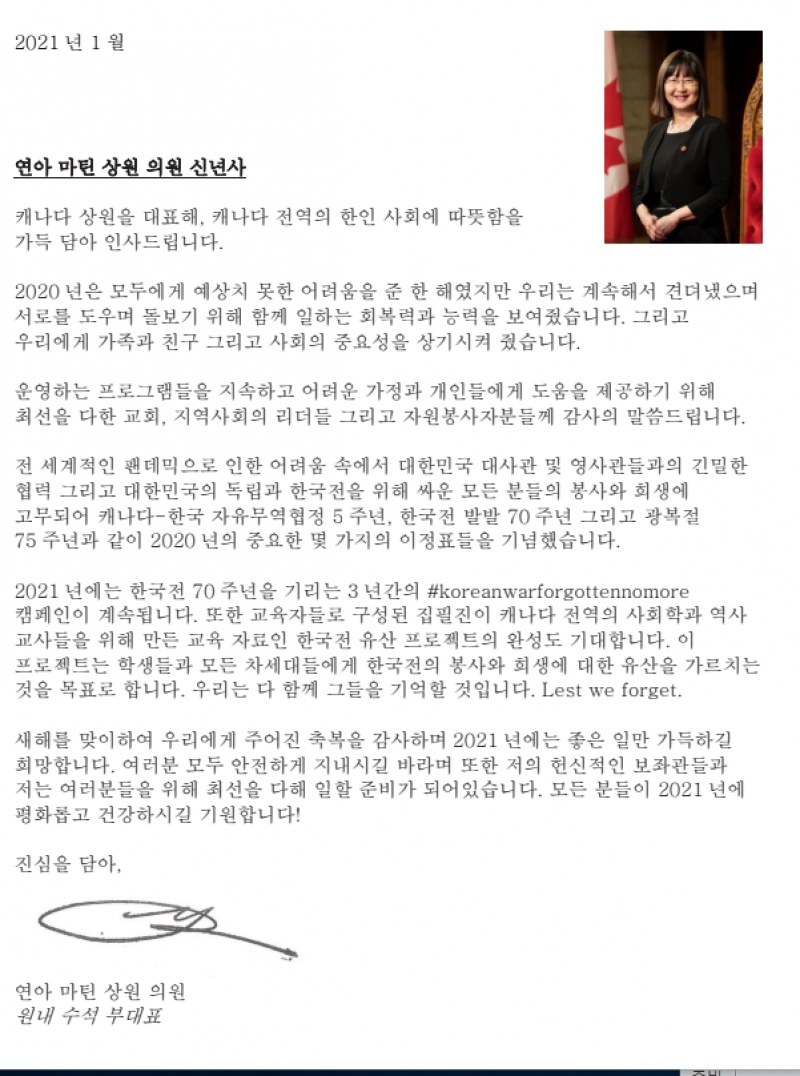 상원의원이라는 자리가 자기 출신 나라 동포만을 위해 일하는 자리는 아니지만, 상원을 대표하여 캐나다 전역의 한인동포들에게 따뜻함을 가득 담아 인사하신다고 하니 드리는 말씀입니다.