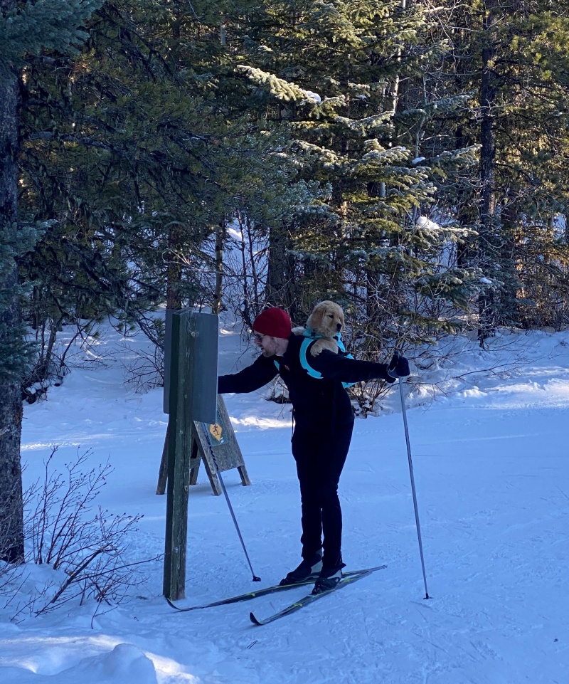 XC스키를 타다보면 스키장에서 아기들을 유모차처럼 생긴 썰매에 앉히고 어깨와 허리에 끊을 달아 썰매를 끄는 사람들도 있구요. 갓난 아기를 등에 업는 경우는 종종 보았지만 이렇게 큰 개(비록 3개월된 강아지라지만..)를 업고 타는 사람은 처음보았어요.