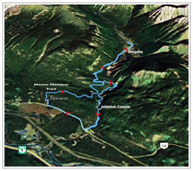 위의 구글맵에서 보듯이 제가 선택한 코스는 존스튼 캐년 주차장에서 서쪽으로 2km 정도 더 내려가면 있는 무스 메도우 Moose Meadow 트레일 주차장에서 시작했습니다. 이곳에서 잉크팟까지 바로 올라갈 수 있고 내려올때는 중간에 존스튼 캐년으로 내려올 수 있습니다. 총 16km정도 걸었구요 고도는 200미터 정도 됩니다.
