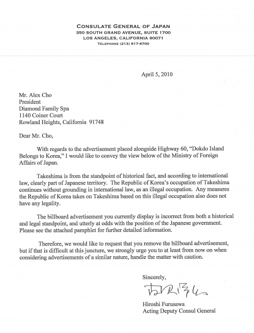 미국 로스앤젤레스(LA) 일본총영사관 측이 LA 근처 고속도로변에 독도홍보 대형광고를 게재한 재미 동포에게 최근 "다케시마(독도)는 일본의 영토"라는 내용의 항의편지를 보낸 것으로 확인됐다. 일본총영사관은 이달 5일 자로 작성한 편지에서 일본 외무성의 견해라면서 "다케시마는 역사적 사실의 관점에서 국제법상 분명히 일본의 영토"라고 주장하고 독도광고를 뗄 것을 요구했다. 사진은 항의 편지 전문이다.