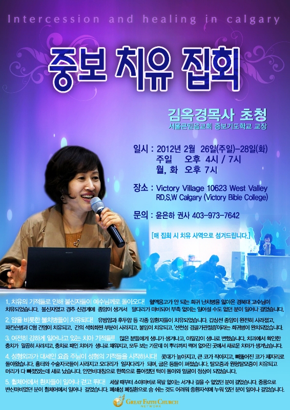 큰믿음교회 김옥경목사님께서 2월26일 주일부터 3일동안 중보치유집회를 캘거리에서 가집니다