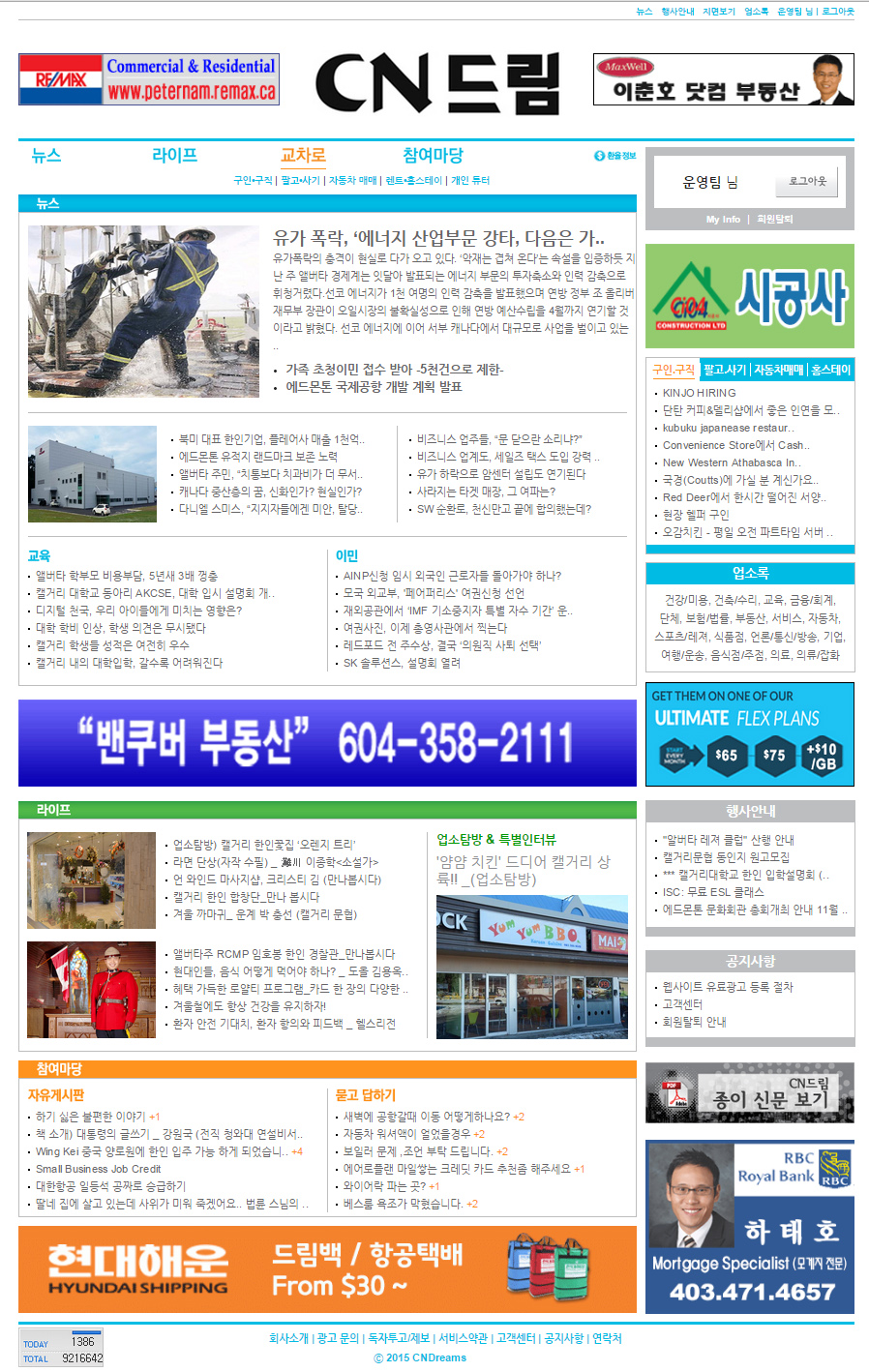 올해로 탄생한지 15주년을 맞이하는 앨버타주에서 가장 오래된 사이트이자 최대 규모 사이트인 CN드림 홈페이지(www.cndreams.com)가 지난해 봄부터 착수한 6차 개편작업이 이제 마무리 단계에 접어들어 드디어 한달후인 3월중에 완료 예정으로 있습니다.