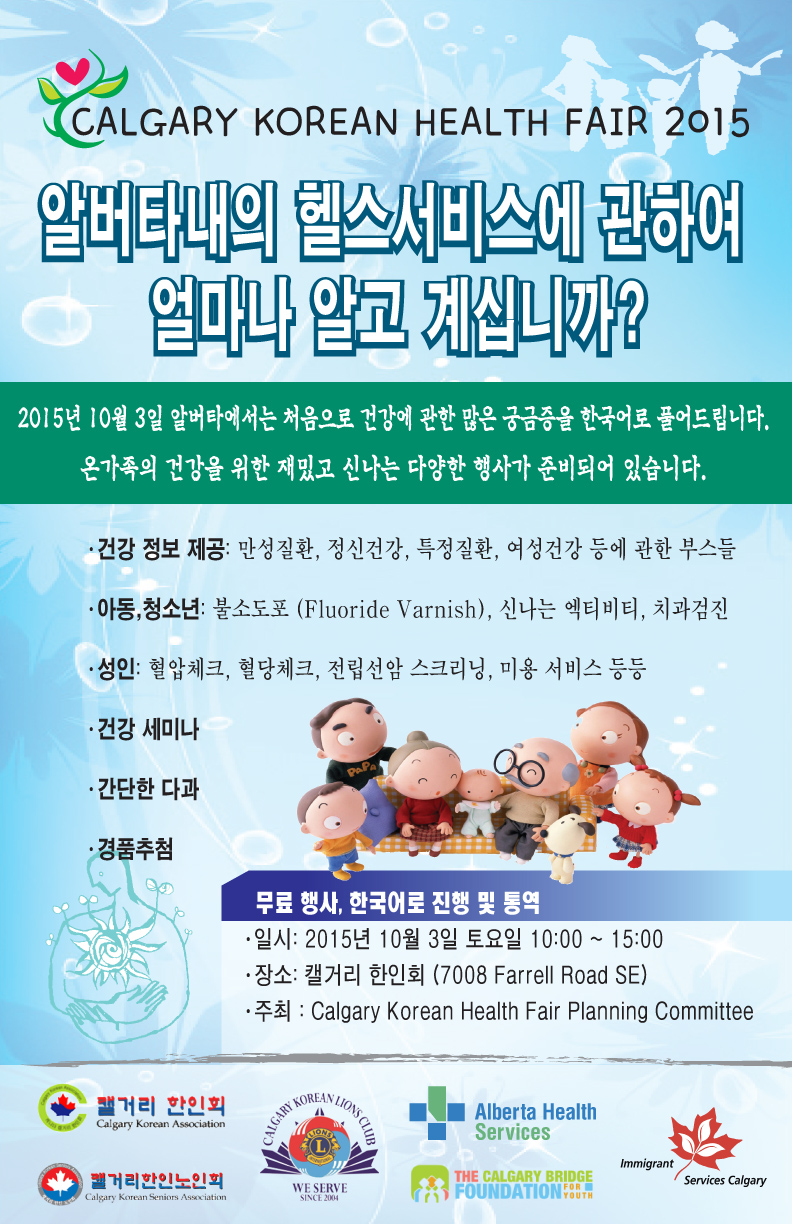 캘거리에서 한인들을 위한 건강 박람회 (Health Fair)를 10월 3일 토요일, 한인회(7008 Farrell Road SE) 에서 오전 10시부터 3시까지 개최할 예정입니다.