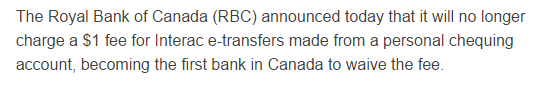 다른 은행들은 아직 Interac e-Transfer 거래당 $1.50씩 청구하는 걸로 압니다.