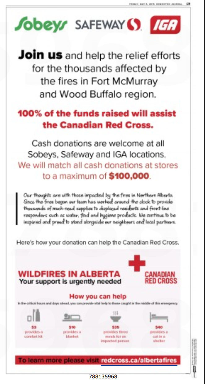이런 가운데 이재민을 돕기위해 캐나다 레드 크로스와 Safeway를 소유하고 있는 Sobeys그룹에서도 나섰네요 (첨부는 일간신문에 난 전면광고입니다)