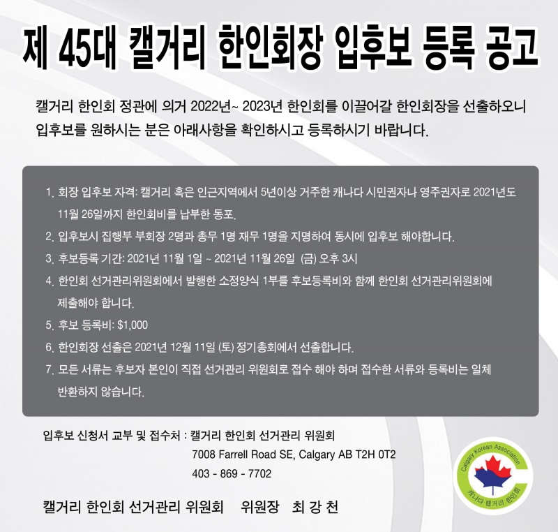 11/10) 캘거리 한인회장 입후보 등록 공고