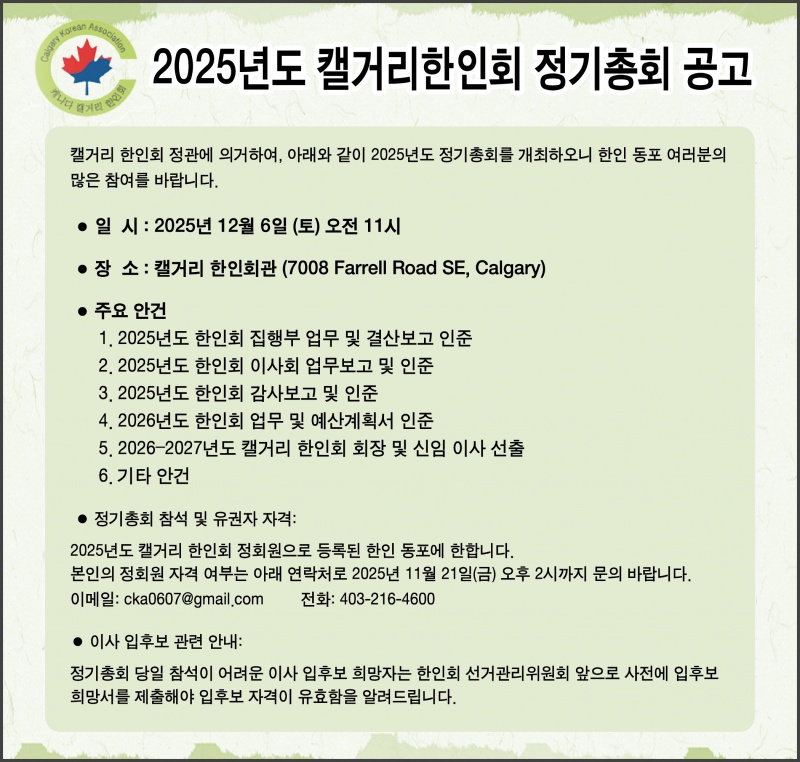 캘거리 한인회 정기총회 공고.. 12월 6일(토)