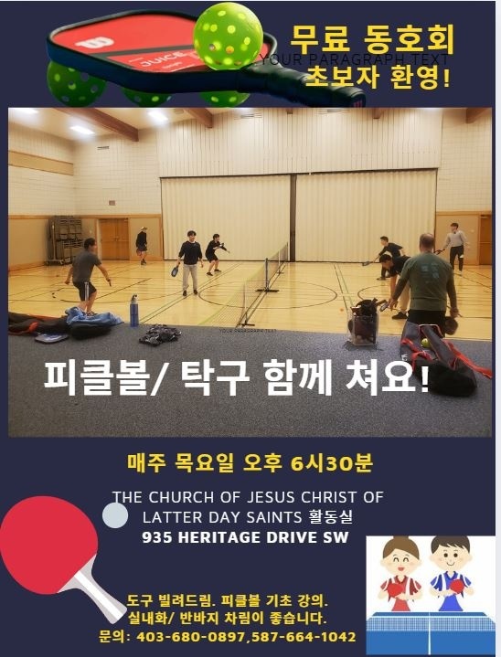 미국에서 가장 인기 많은 피클볼이 캘거리에서도 유행입니다. 자원봉사 코치들이 있어 기초를 가르쳐드립니다. 라켓과 볼도 구비되어있습니다.
