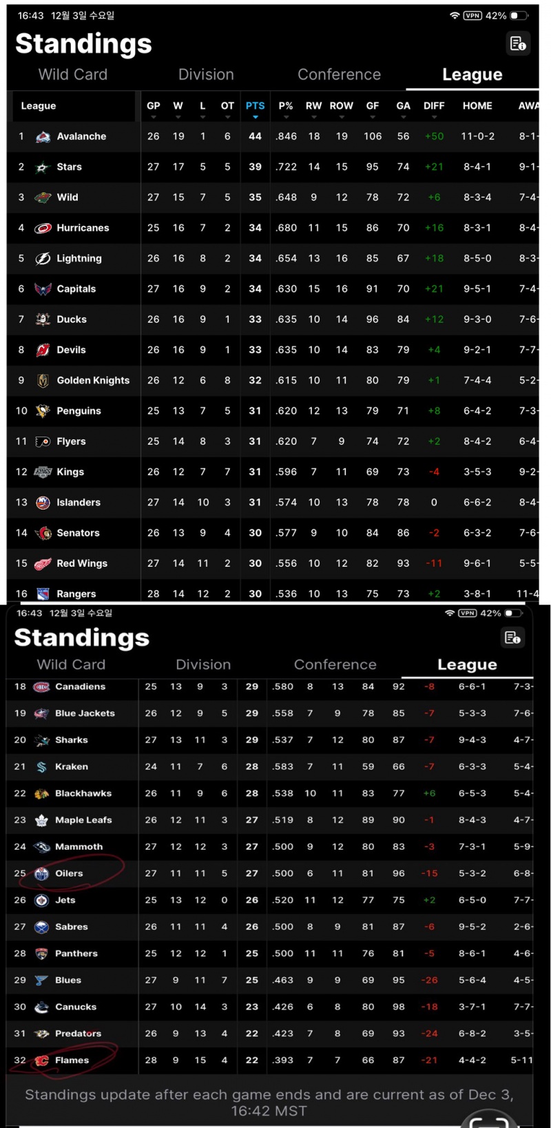 총32개팀중에서 캘거리는 꼴찌인 32위, 에드먼튼은 그나마 조금 나아서 25위를 기록하고 있네요 (12월 3일 기준) 두팀 모두 정규시즌 성적으로는 역대 최악을 달리고 있는 상황입니다.