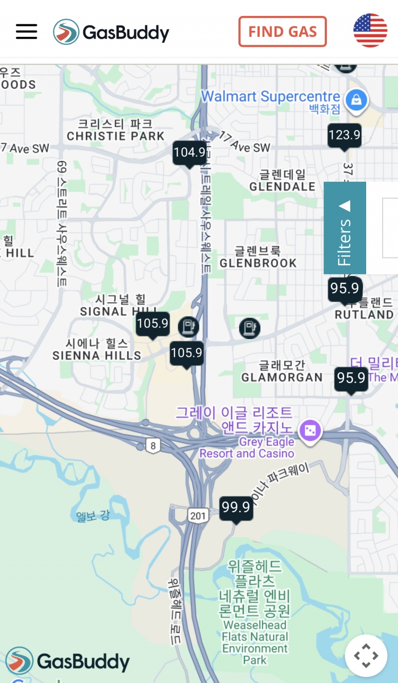 캘거리 SW시그널 힐 수퍼스토어가 105.9 , 인근 원주민 지역 주유소가 99.9이구요. 더 남쪽 코스코 주유소는 97.9를 가르키고 있어요.