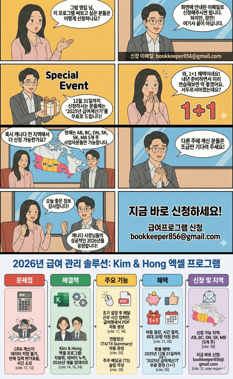 2026년형 급여 계산 프로그램 (유료제공)이 필요하시거나, 캐나다 스몰 비즈니스 회계 및 세금 신고에 대한 상담이 필요하신 분은 아래 이메일로 언제든지 연락해 주시기 바랍니다.