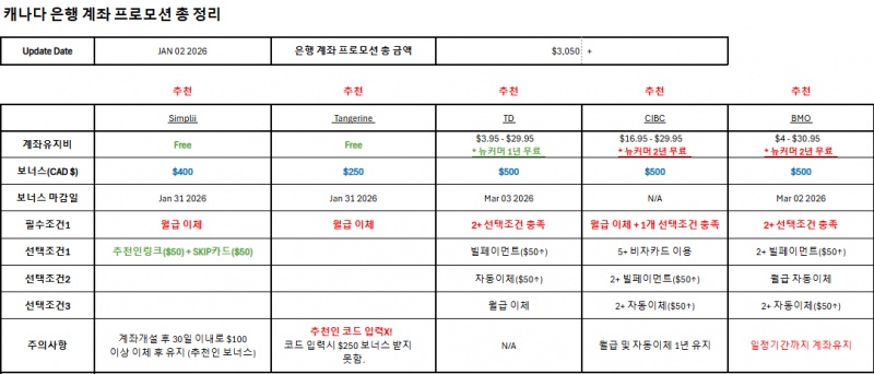 - CIBC: 프로모션 금액 $500로 조정 (SKIP $100 기프트카드 프로모션 없어짐)