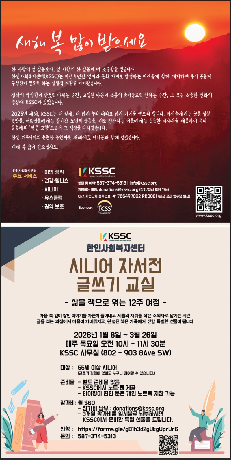 캘거리 한인사회복지센터.. 신년인사및 시니어 자서전 글쓰기 교실 안내