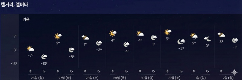 캘거리 주간 날씨 (1월 26일 - 2월 2일)