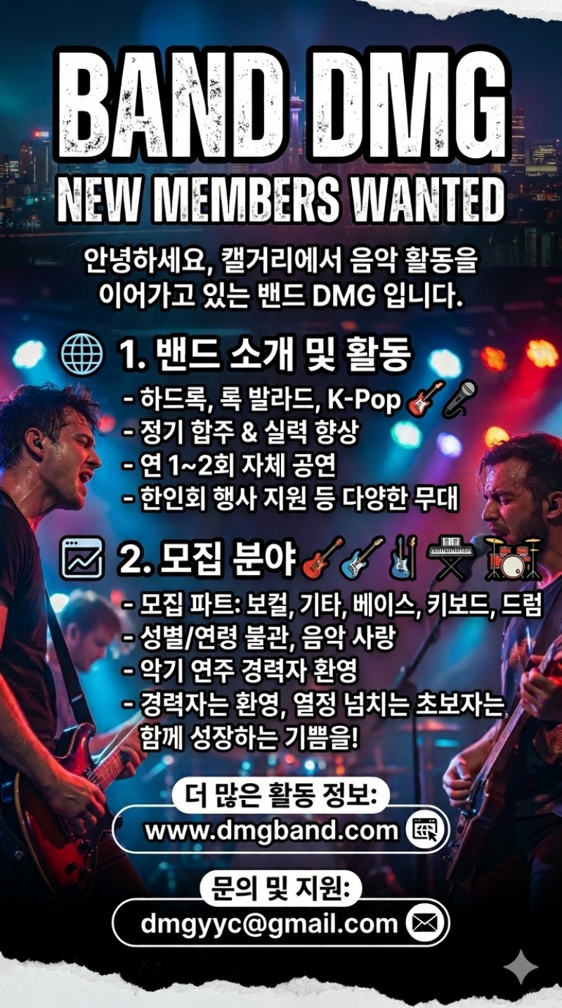 DMG는 음악을 사랑하는 분들과 더 넓게 교류하며 즐거운 무대를 만들어가고 싶습니다. 밴드 멤버 모집은 계속 진행 중이니, 관심 있는 분들의 많은 연락 바랍니다.