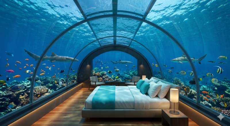 수심 약 5미터(16피트) 아래에 위치한 이 방은 사방이 투명한 유리로 되어 있습니다. 침대에 누운 채로 상어와 다채로운 물고기들이 유유히 헤엄치는 모습을 감상할 수 있다니, 상상만으로도 정말 신비롭고 짜릿한 기분이 들더라고요.