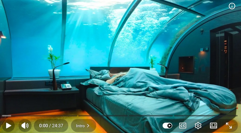 *유튜버가 전용 엘리베이터를 타고 물속으로 내려가는 8분 4초부터 본격적인 심해 투어가 시작됩니다. 이후 13분 50초쯤에는 상어가 지나는 해저 레스토랑에서의 저녁 식사 장면이 나오고, 16분 55초에는 바닷속 침실에서 아침을 맞이하는 생생한 모습을 볼 수 있습니다. 그러다 17분 30초에 다시 물 밖으로 나와 야외 조식을 먹으면서 해저 체험은 완전히 끝이 납니다.*
