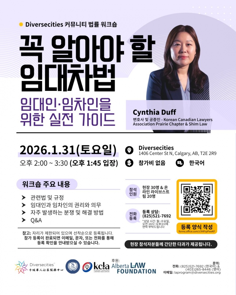 비영리 단체 Diversecities에서 한인들을 위해 임대차법의 핵심과 실제 분쟁 해결 방법을 알아보는 시간을 마련했습니다. 임대인과 임차인의 권리와 의무, 자주 발생하는 분쟁 사례까지 다루는 유익한 시간이 될 예정이니 많은 관심과 참여 부탁드립니다!