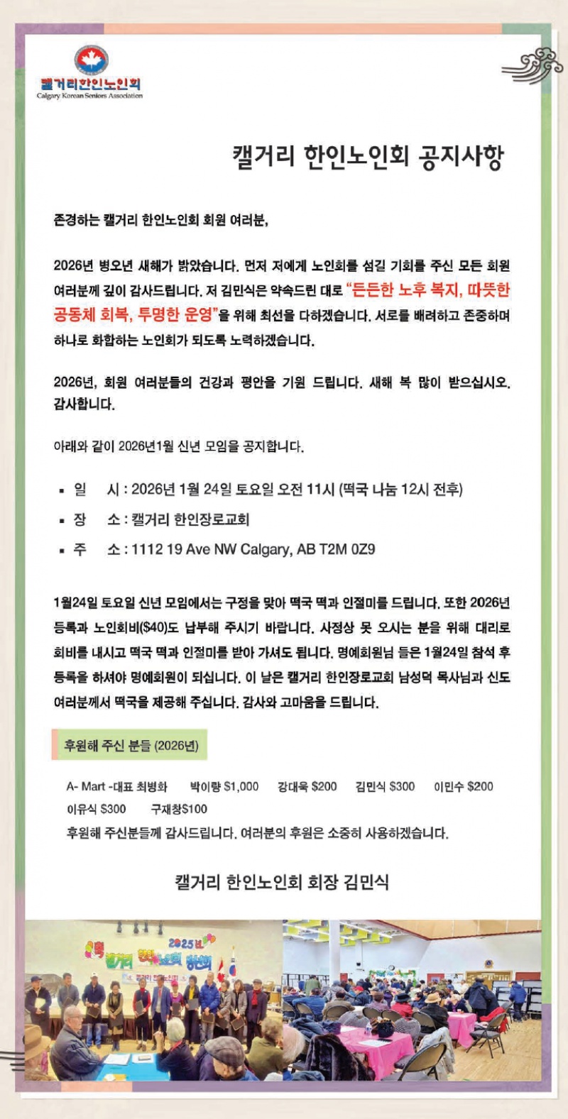 캘거리 노인회 신년 첫 모임 안내.. 1월 24일(토) 오전 11시