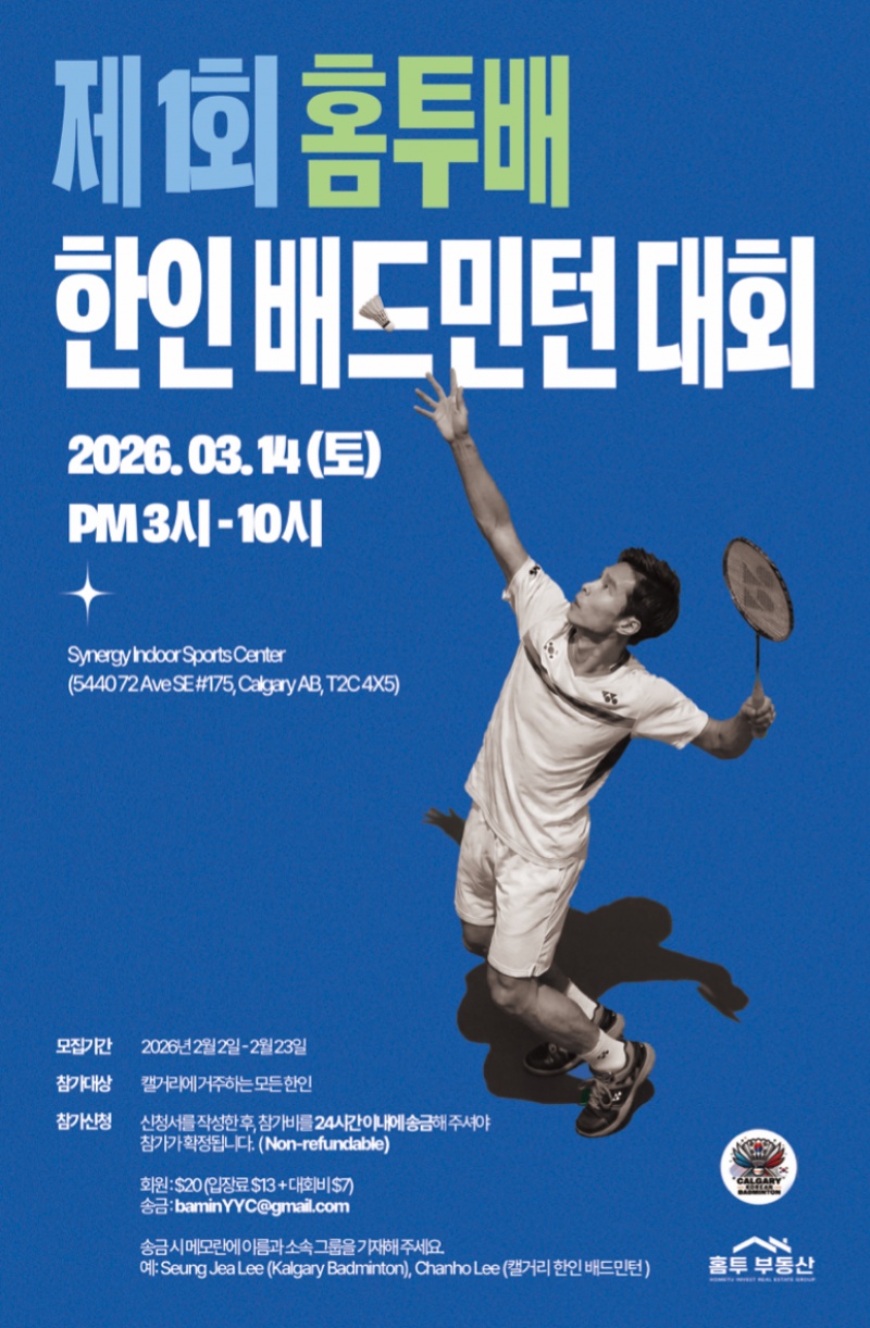 홈투 부동산 과 Kalgary Badminton 과 캘거리 한인 배드민턴 클럽에서 주최하는 제1회 홈투배 한인 배드민턴 대회에 여러분을 초대합니다. 이번 대회를 통해 한인 커뮤니티가 배드민턴의 즐거움을 함께 나누는 소중한 자리가 되길 바랍니다.