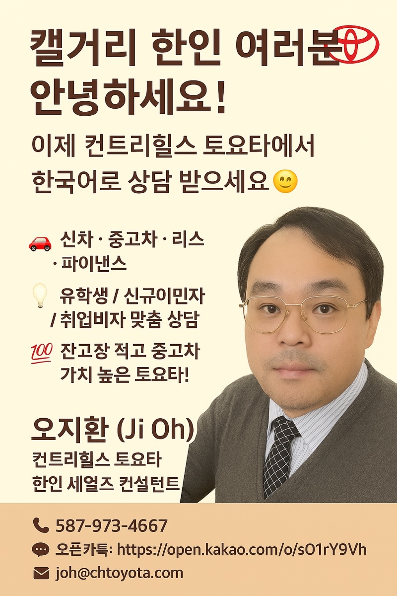 [구직] 안녕하세요, 캘거리 교민 여러분! 캘거리 **컨트리힐스 토요타(Country Hills Toyota)**에서 새롭게 시작하는 **한인 세일즈팀의 오지환(Ji Oh)**입니다.