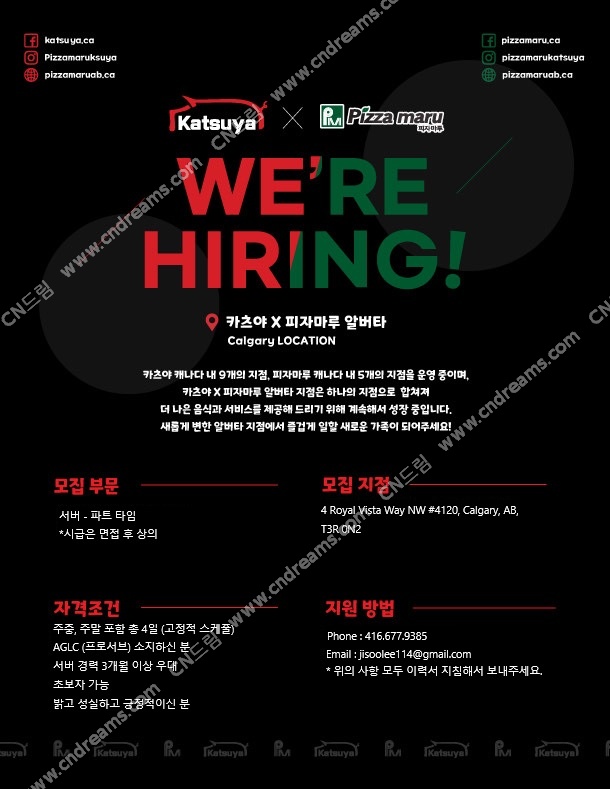 안녕하세요, 카츠야X피자마루에서 함께 일할 서버분을 구인중입니다. 저희 매장이 혼자 일하는 시간이 많아 손이 빠르신 분을 선호하고 있습니다. 초보자 분들도 환영하오니, 언제든지 연락 주시길 바랍니다. 위 사진으로 연락처 또는 이메일 보내주실 때, 본인 성함과 나이를 함께 얘기해주시면 감사하겠습니다.