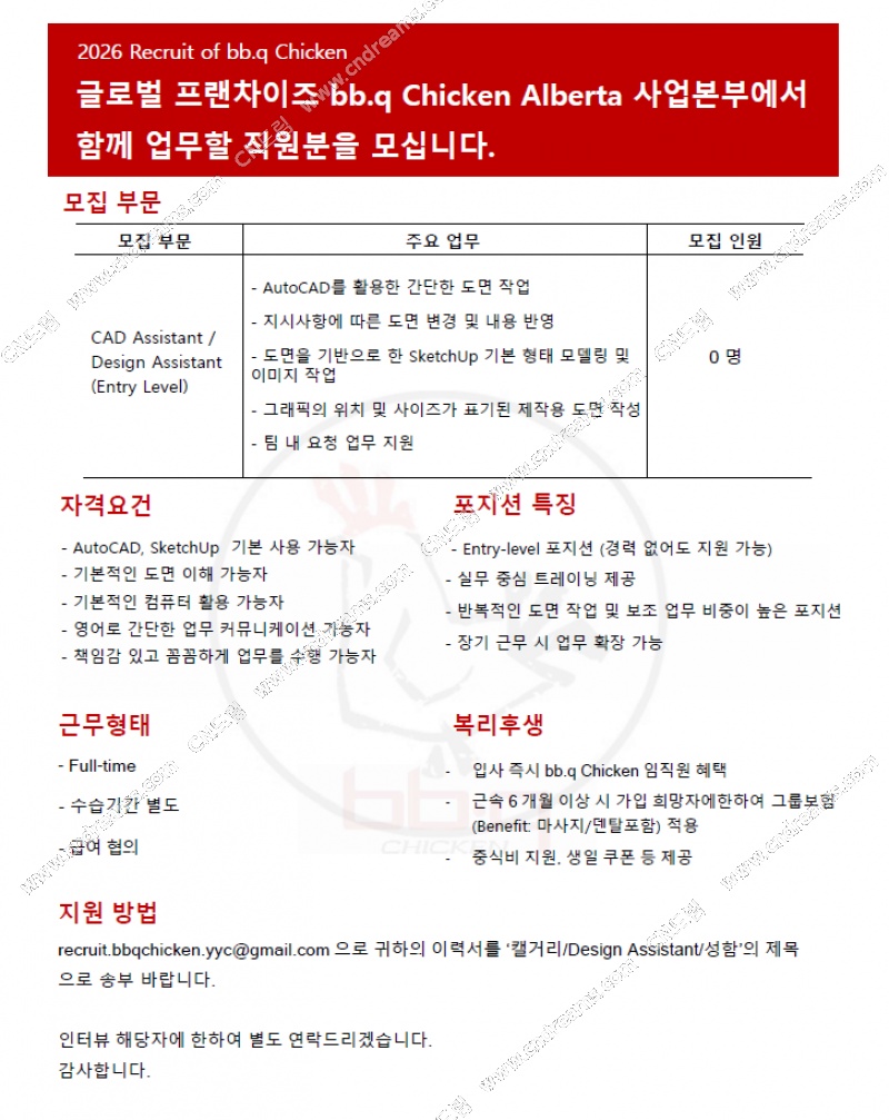 [구인] bb.q Chicken 본부 / CAD Assistant/Design Assistant (Entry Level) / Calgary