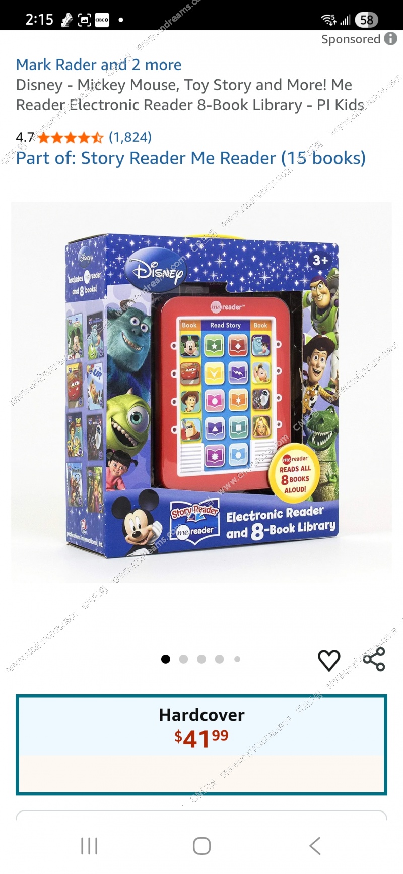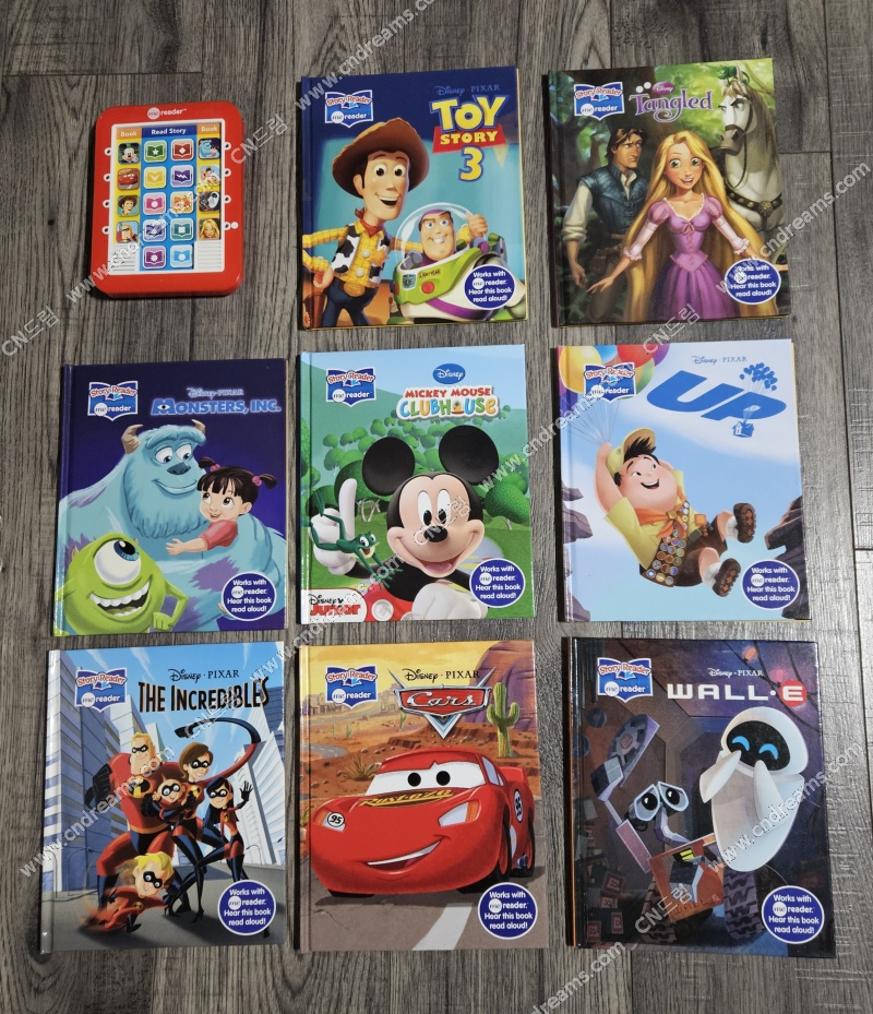디즈니/픽사 캐릭터들이 등장하는 "Me Reader" 전자 리더기 및 8권의 하드커버 도서 세트입니다. 이 세트는 아이들이 독립적인 읽기를 연습하고 독서에 흥미를 느끼도록 돕기 위해 고안되었습니다.