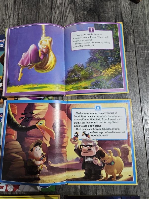 - 구성: '토이 스토리 3', '라푼젤', '몬스터 주식회사', '미키 마우스 클럽하우스', '업', '인크레더블', '카', '월-E' 등 8권의 디즈니/픽사 스토리북과 전자 리더기로 구성되어 있습니다.