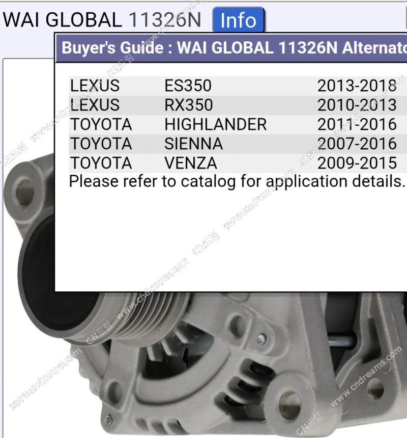알터네이터와 대부분의 부품은 2011-2016 highlander와 Camry, Luxus 등등에 맞습니다. 자세한 정보는 위 사진을 참고 하시기 바랍니다.