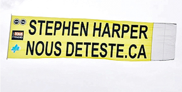 지난 1일 스티븐 하퍼 연방총리를 비난하는 플래카드를 단 비행기가 오타와 상공을 비행하다 연방경찰의 지시로 강제착륙했다고 CBC 방송이 보도했다.플래카드에는 ‘STEPHEN HARPER NOUS DETESTE.CA’라는 문구가 인쇄돼있었다. 불어를 ..