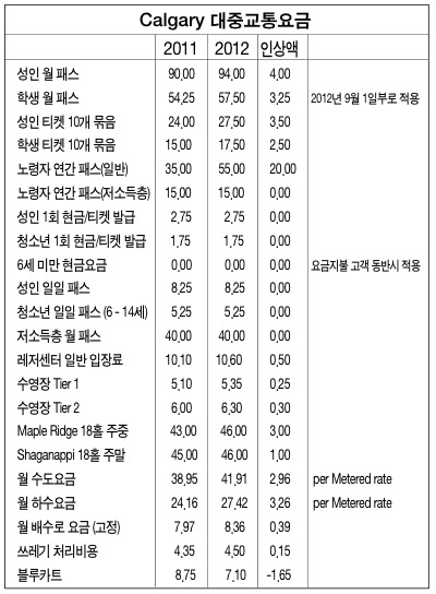 2012년 새해를 맞아 공공요금이 줄줄이 인상돼 가계 주름살만 깊어지게 됐다.우선 대중교통요금의 경우 노령자 연간패스는 지난해보다 20달러 오른 55달러가 적용된다. 노령자 연간패스 가격이 인상되기는 지난 95년이후 처음이다. 지난달 시의회에서는 노..