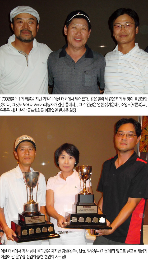 - 남녀 챔피언에 김한, Mrs. 양승우씨가 차지 -- 홀인원 2개나 나와 자동차를 선물로 받아 -지난 9월8일(목) 캘거리 골프 협회(회장 변 재욱)에서 주최하고 Parkland Processing(녹용회사 대표 한 이동)에서 후원하는 골프협회 Closing대회가 캘거..
