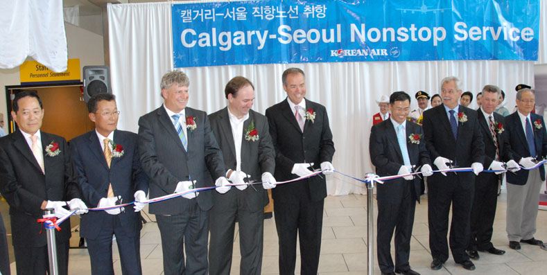 - 브론코니어 시장도 참석하여 축하 - - 7월 25일부터 8월 26일까지 주 3회 운항 -지난 7월 27일(화) 오후 2시 30분 캘거리 국제공항 국제선 Check-in 카운터 행사장에서는 대한항공 캘거리-인천행 직항편 개통을 축하하는 기념식 행사가 성..