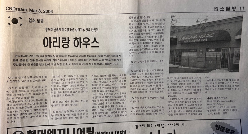 본지에서는 지난 2월 6일 캘거리 남쪽( Canyon Meadows Drive와 Macleod Trail이 만나는 지점)에 새롭게 문을 연 전통 한식당 아리랑 하우스(매니져 : 토마스 김)가 짧은 기간임에도 불구하고 이곳 지역 주민들에게 큰 호응을 얻고 있어, 지난 24..