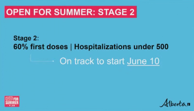 앨버타 내의 코로나 입원환자가 점차 줄어드는 추세를 보임에 따라 여름을 위한 재개 2단계가 오는 10일부터 시행된다. 2단계는 12세 이상의 주민 중 60%가 최소 1번의 백신 접종을 마치고, 코로나 입원환자가 500명 이하로 유지되며 줄어드는 추세..