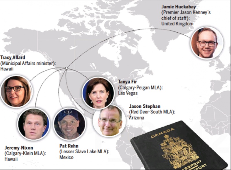 UCP 내각 장관 및 의원 그리고 주수상 비서실장 등 고위직 인사들이 팬데믹 와중에 해외 여행을 다녀 오거나 현재 외국에서 체류 중인 사실로 인해 앨버타 민심이 들끓고 있다. 여기에 더해 케니 주수상이 해당 장관들과 자신의 비서실장의 외유에 대해 “..