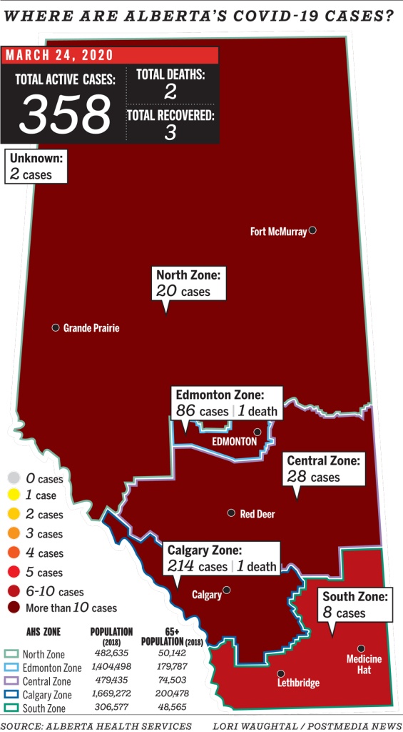3월 24일 기준, 앨버타의 코로나 19 확진 환자가 전날에 비해 57명 늘어난 358명이 됐다. 이는 지금까지 앨버타에서 하루에 발생한 확진자 숫자 중 가장 많은 것이 된다. 또한 초기의 모든 확진자가 해외여행과 직접적인 관련이 있었던 것과 달리,..