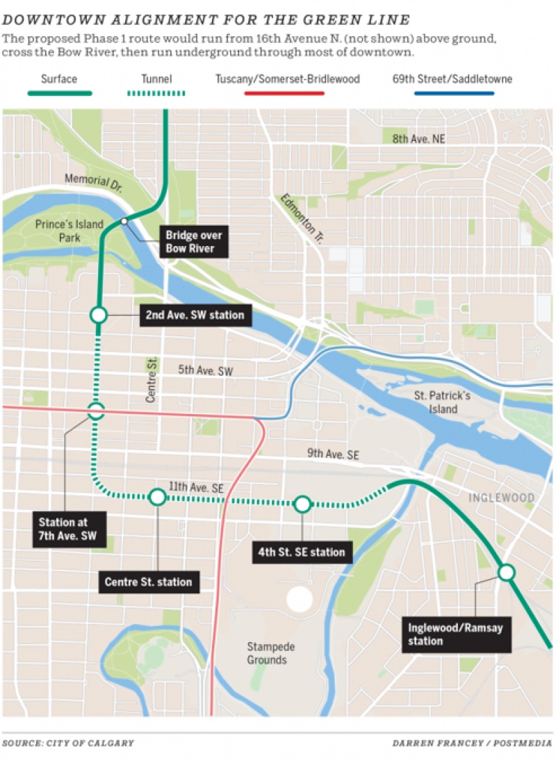캘거리 시, 그린라인 노선 변경 추진...예산 부족이 주원인, 보우..