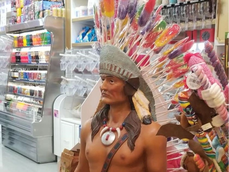 웨스트 에드먼튼 몰의 사탕 가게 앞에 자리 잡았던 막대 사탕으로 만든 머리 장식을 하고 있는 원주민 조각이 창고로 치워졌다. 신성한 물건을 부적절하게 이용하고 있다는 불만이 제기됐기 때문이다. 사탕 가게 Bubble and Gum은 지난 6월 27일에 개점했..