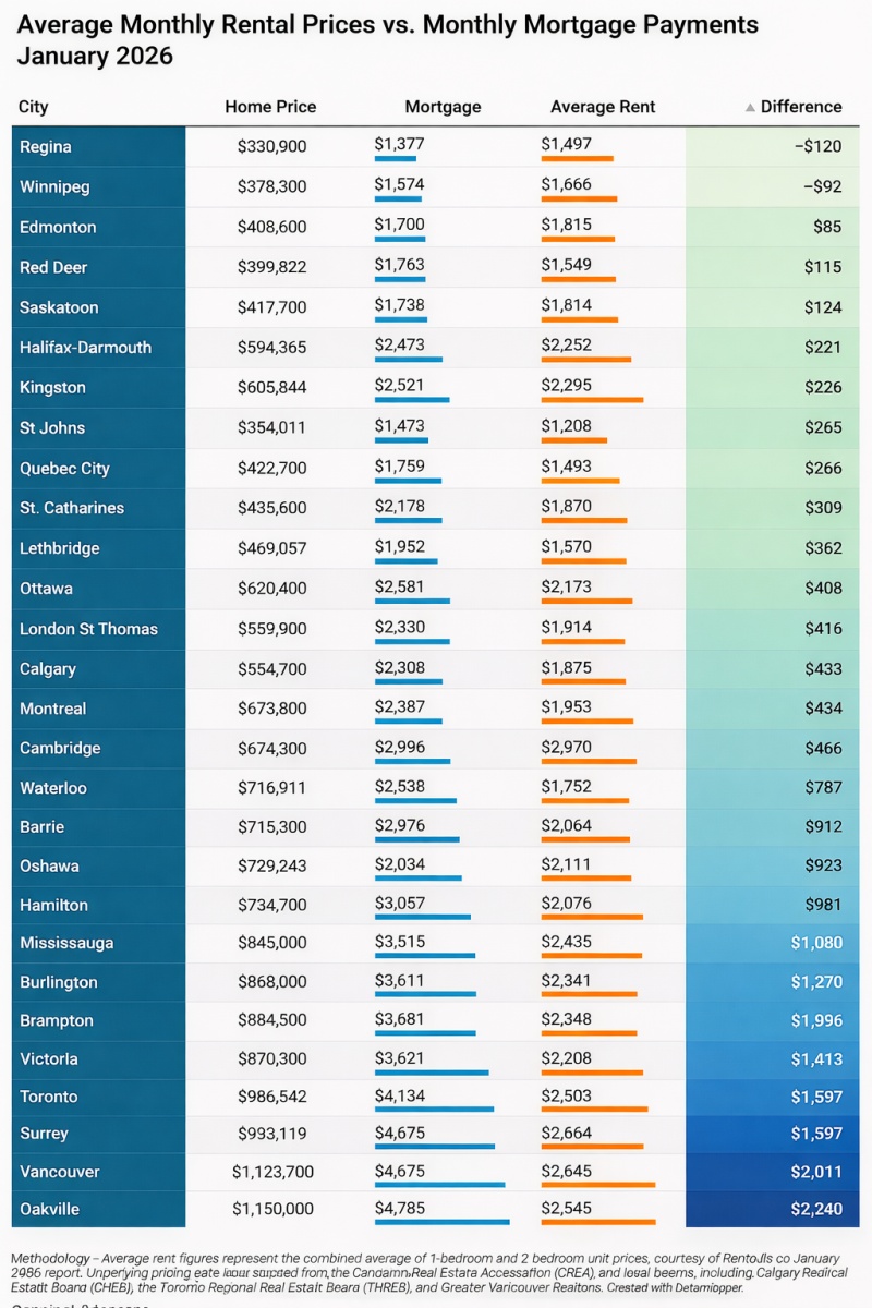 (안영민 기자) 캐나다 주요 도시에서 주택을 매입해 모기지를 갚는 것보다 임대 주택에 거주하는 편이 월 지출을 줄일 수 있다는 분석이 나왔다. 2026년 1월 기준 평균 월 임대료와 월 모기지 상환액을 비교한 자료에 따르면, 대다수 대도시에서 임대가..
