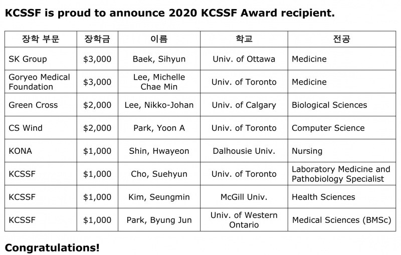 캐나다한인과학장학재단(KCSSF)은 젊은 과학 기술 인재 양성을 위해 올해에도 총 8명의 장학생을 선발하였습니다. 장학금 수여식은 CKC 기간인 9월 3일(금) 밤 9시 (캐나다 동부시간) 부터 시작되는 Closing and Award Ceremony에서 온라인 또..