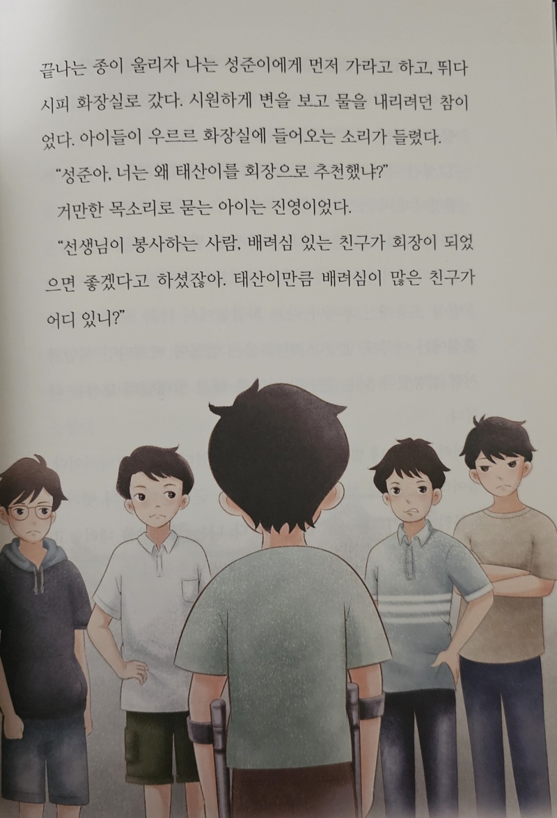 두 번째 이야기〈진짜 사나이〉 키가 작은 태산이는 반장 선거에서 키 큰 진영이한테 지고 아빠를 닮아 키가 작다고 아빠를 원망해요. 진영이는 키 작은 태산이를 놀리고, 어느 날 골목에서 진영이가 불량배들한테 당하는 걸 목격하고 나무 뒤에 숨어 “진영아, 조금만 기다려. 내가 신고할 게.”_p38